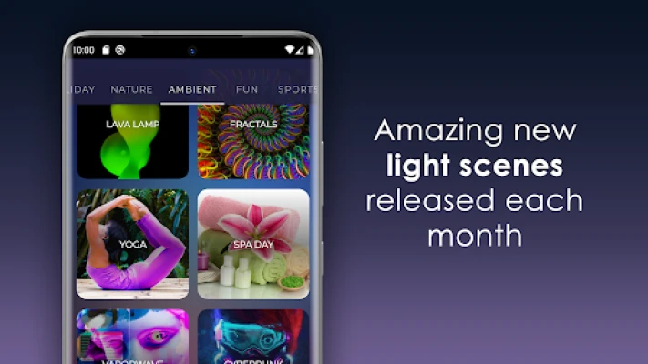 Relaxing ambiance lighting with smooth color flows, nature scenes, health spa style experiences.